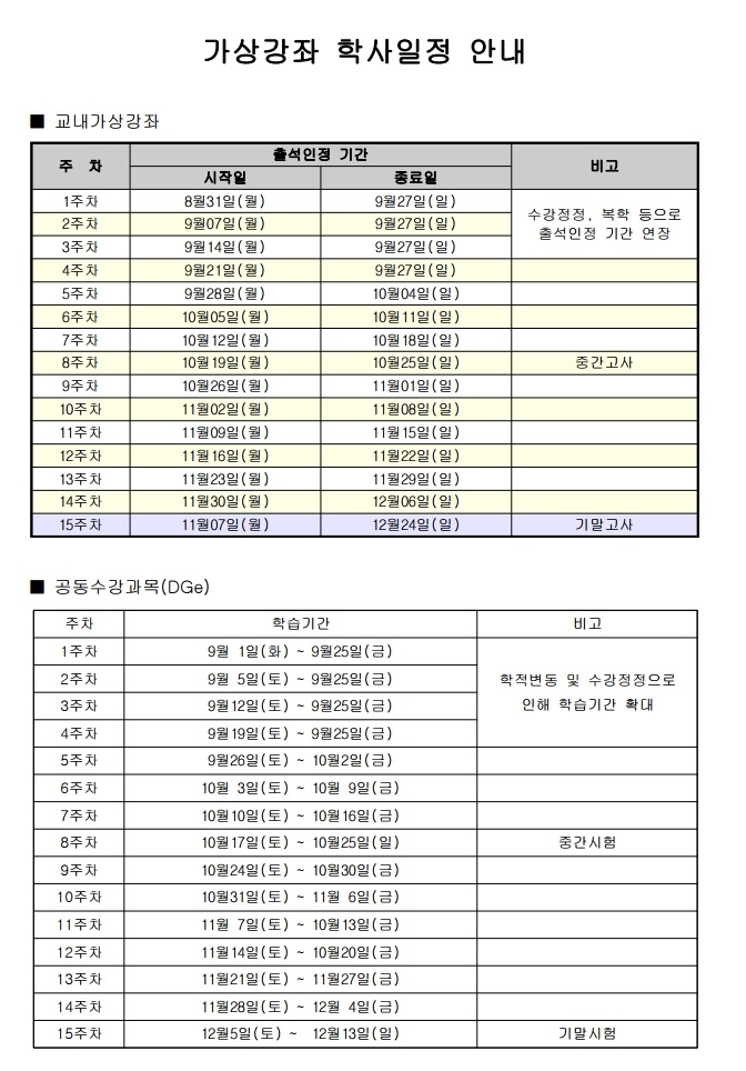 HOME > 학과공지 > 2020학년도 2학기 가상강좌 개설교과목 및 수강방법 안내 커뮤니티학과공지 정보게시판 갤러리 동영상 장교가 되는 길 학과공지 2020학년도 2학기 가상강좌 개설교과목 및 수강방법 안내 . 목록보기